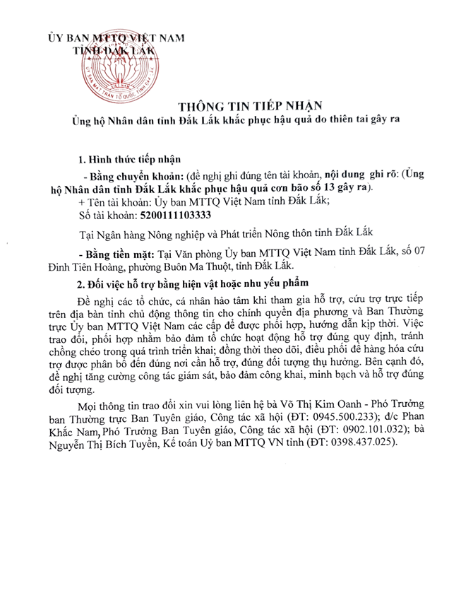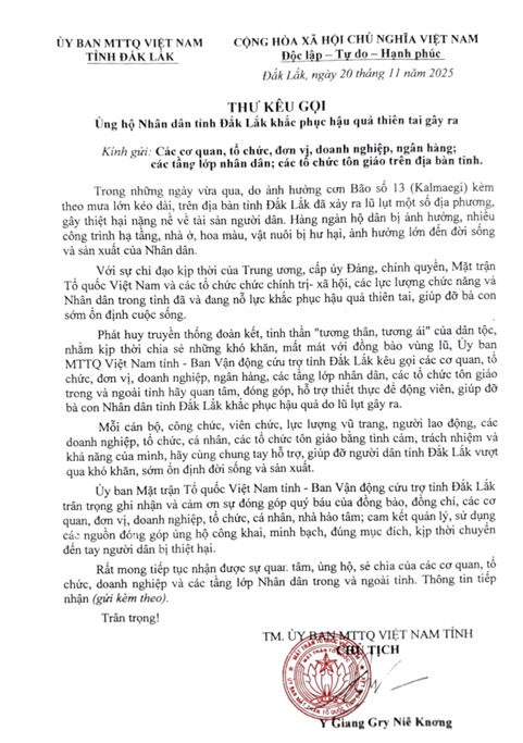Ủy ban Mặt trận Tổ quốc Việt Nam tỉnh Đắk Lắk vừa có Thư kêu gọi gửi các cơ quan, tổ chức, đơn vị, doanh nghiệp, ngân hàng, các tầng lớp Nhân dân, các tổ chức tôn giáo trên địa bàn nhằm ủng hộ Nhân dân tỉnh Đắk Lắk khắc phục hậu quả thiên tai gây ra.